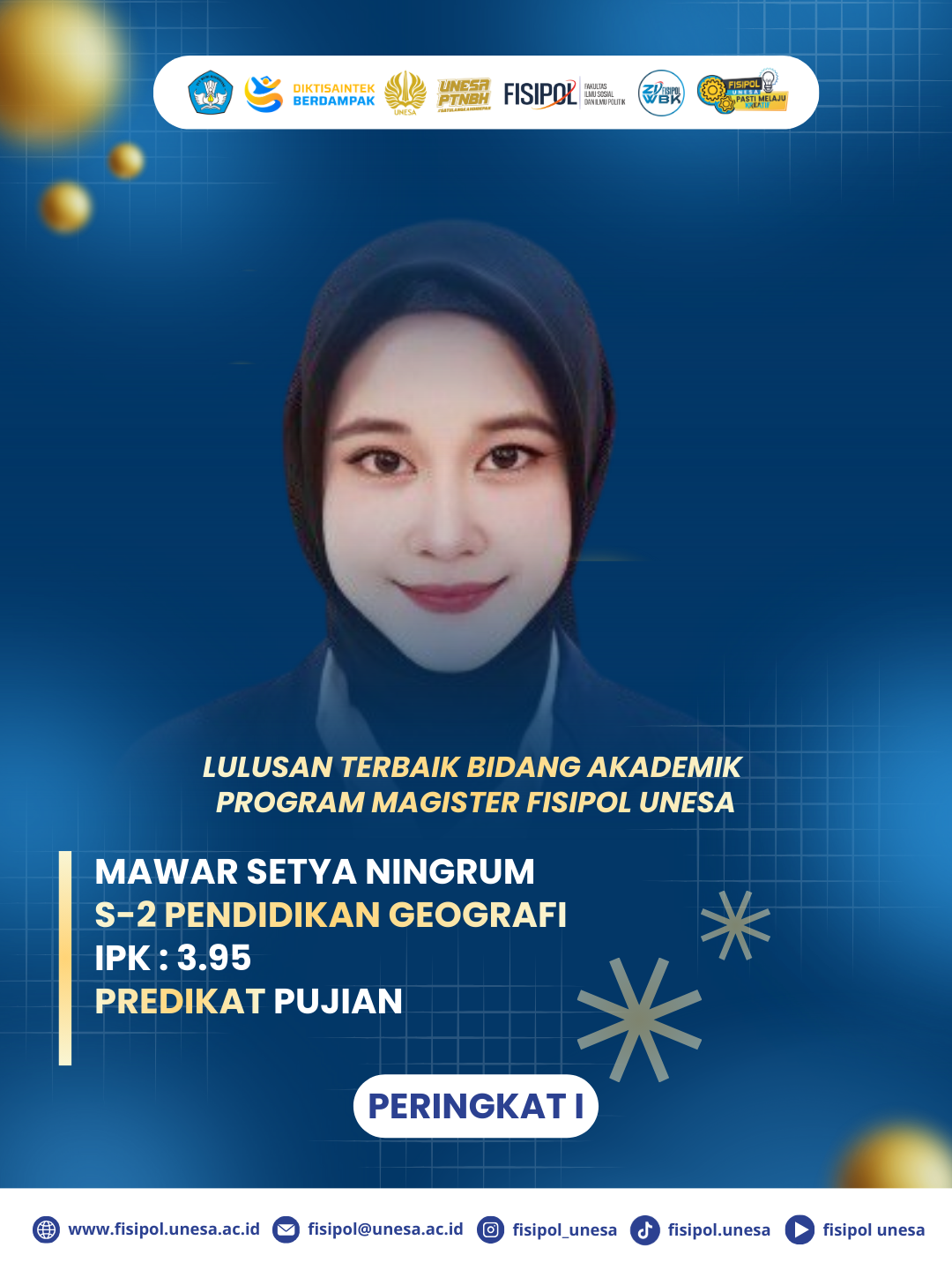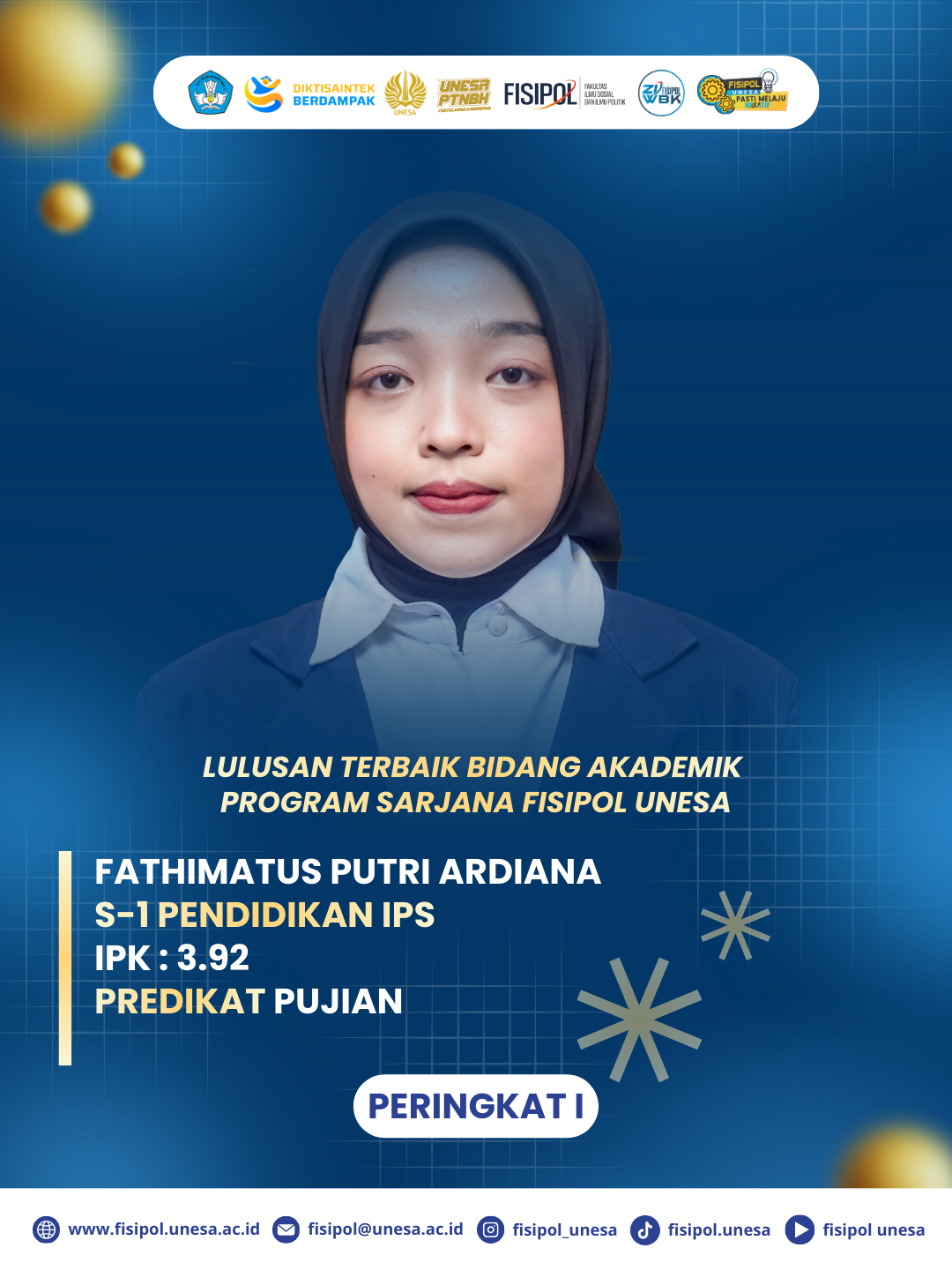 Selain menetapkan kelulusan, FISIPOL UNESA juga memberikan apresiasi kepada mahasiswa berprestasi melalui penetapan lulusan terbaik Program Sarjana (S1). Predikat lulusan terbaik peringkat pertama diraih oleh Fathimatus Putri Ardiana dari Program Studi S1 Pendidikan IPS dengan capaian IPK 3,92.